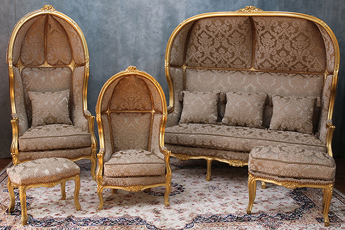 La personnalisation est également un atout majeur : chaque client peut choisir l’essence du bois (hêtre, chêne, bois doré), la teinte (naturelle, cérusée, patinée, laquée), ainsi que le tissu (velours uni, capitonné, damas fleuri, cuir patiné, soie brodée). Ce choix permet de créer un canapé Carrosse baroque ou Louis XV parfaitement adapté à son intérieur, qu’il s’agisse d’un château, d’un hôtel particulier, d’un restaurant haut de gamme ou d’un salon privé. Certains préfèrent un bois doré à la feuille et un velours bordeaux profond, d’autres optent pour un bois cérusé blanc et un velours gris anthracite pour un effet plus contemporain. Dans tous les cas, le canapé conserve sa majesté et devient la pièce centrale de la décoration.