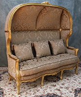 Le canapé Carrosse de style baroque se distingue par son exubérance, ses formes généreuses et son décor sculpté. Les boiseries en hêtre massif sont travaillées avec un soin particulier : chaque courbe, chaque moulure, chaque volute est sculptée à la main selon un savoir-faire artisanal transmis de génération en génération. L’art baroque, marqué par le goût du faste et de la théâtralité, trouve dans le canapé Carrosse une expression parfaite. Le dossier, souvent capitonné, met en valeur des tissus riches comme le velours, la soie ou le damas, tandis que les finitions dorées, argentées ou cérusées soulignent la noblesse du bois. L’assise, large et confortable, invite à la détente tout en affirmant un caractère imposant et prestigieux.